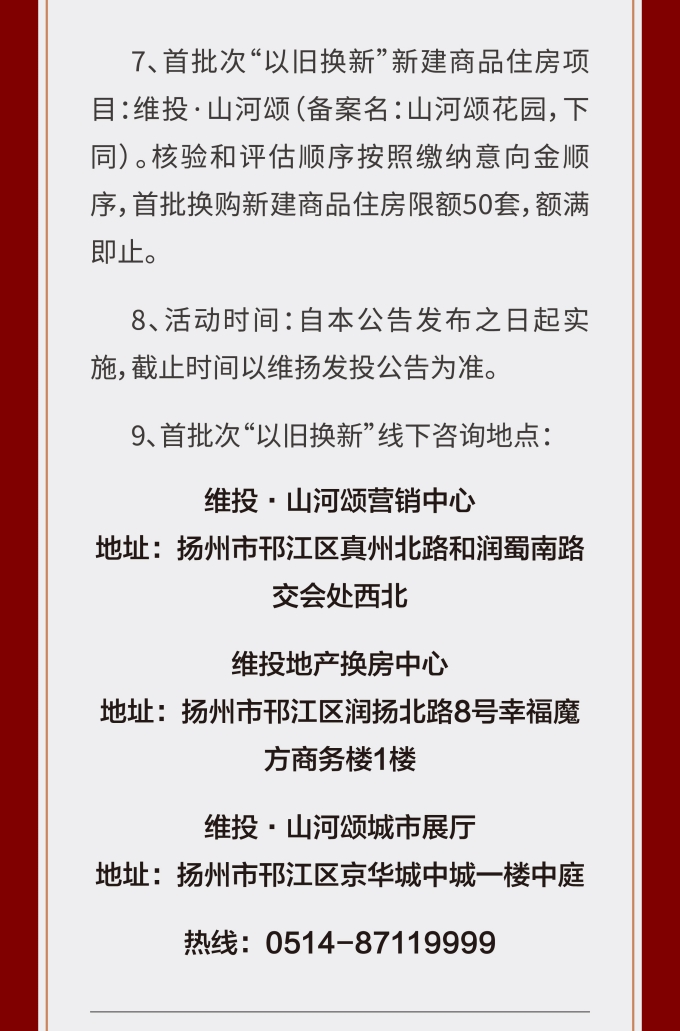 維揚(yáng)地產(chǎn)積極響應(yīng)政府新推行的“以舊換新”政策,踐行“惠民”理念,打造高品質(zhì)住宅,滿(mǎn)足揚(yáng)州人民改善型住房需求。此次維揚(yáng)發(fā)投“以舊換新”工作以其自主開(kāi)發(fā)的維投·山河頌項(xiàng)目為試點(diǎn),由國(guó)企背書(shū)、置換范圍廣、全流程專(zhuān)業(yè)服務(wù)。首批換購(gòu)新建商品住房限額50套,換購(gòu)人可通過(guò)登錄“維揚(yáng)發(fā)投商品住房‘以舊換新’線上報(bào)名系統(tǒng)”報(bào)名,具體要求詳見(jiàn)公告。